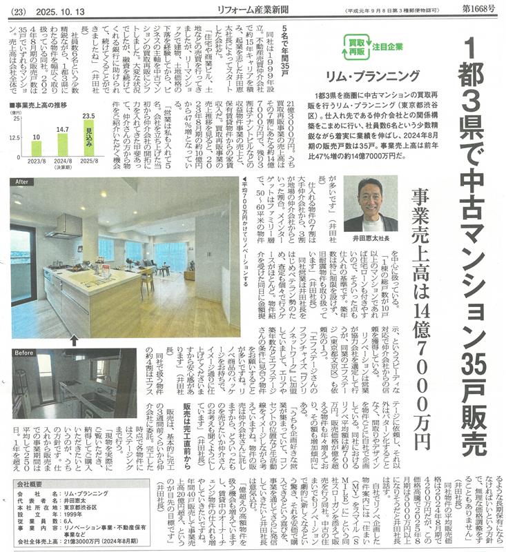 株式会社リム・プランニング リフォーム産業新聞に記事が掲載されました